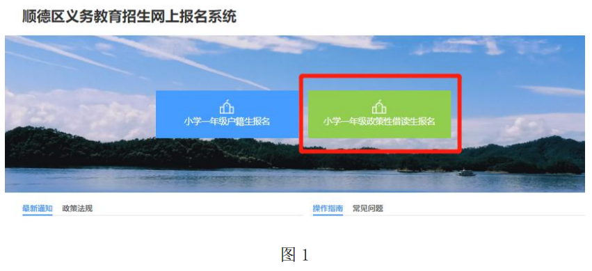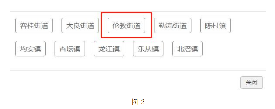 (一)【入口选择】:点击左侧“小学一年级政策性借读生报名”报名入口(图 1),按居住地地址选择所属镇街道,如:伦教街道(图 2)。
