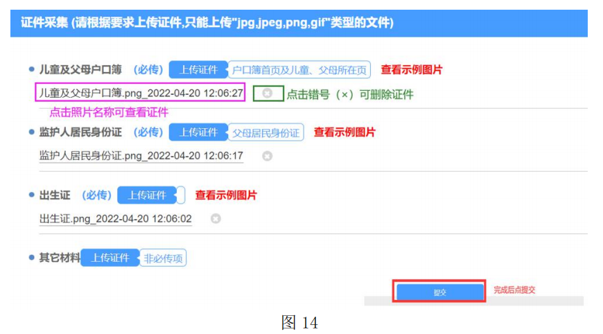 5.证件全部上传完成后,点击“提交”(图 14)。