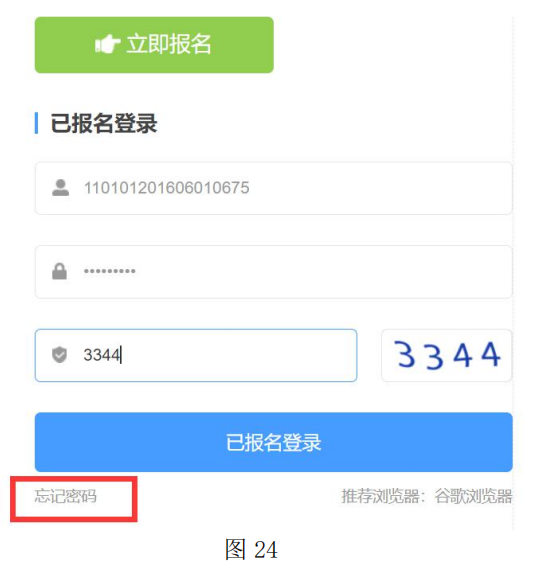 家长可通过报名系统报名页面上的“忘记密码”按钮进行密码重设,如图 24。