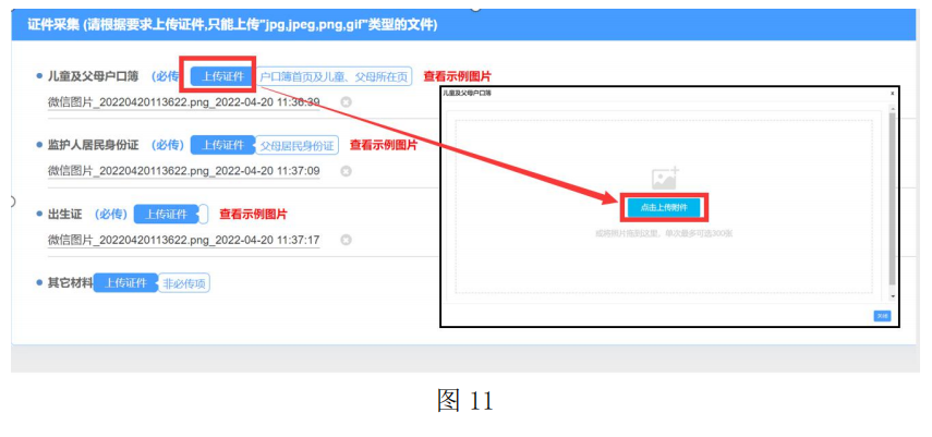4.上传成功会显示在下方,点击照片名称可查看证件,双击可查看证件大图,旋转图片,错号(×)可删除证件(图 11)。