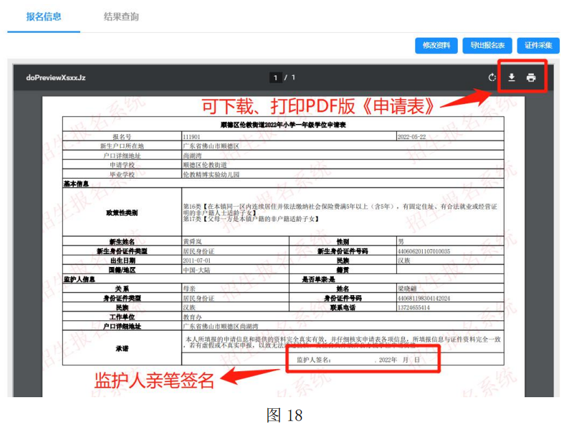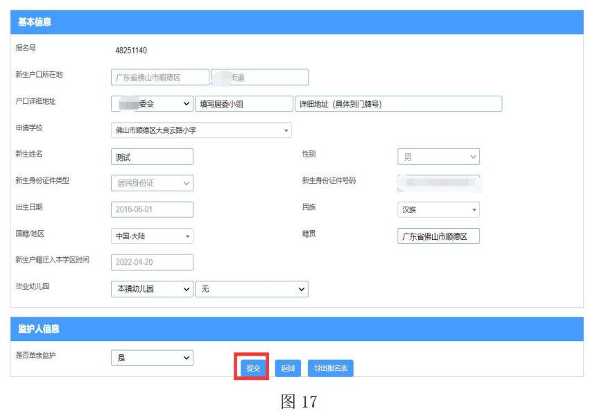 1.【修改资料】:返回基本信息、监护人信息、证件采集页面,修改完成后点击“提交”。无修改点击“返回”(图 17)。