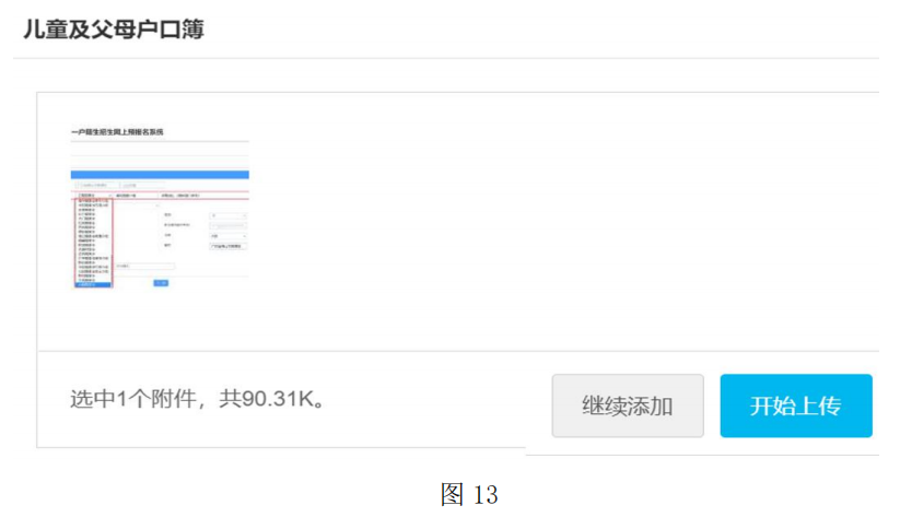 3.证件上传或拖动至页面后,点击“继续添加”或“开始上传”(图 13)。