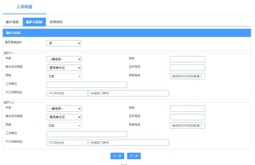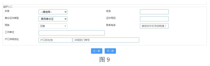 3.如果不是单亲,是否单亲监护选“否”,继续填写监护人二的相关信息,操作方法同监护人一。(图 9)