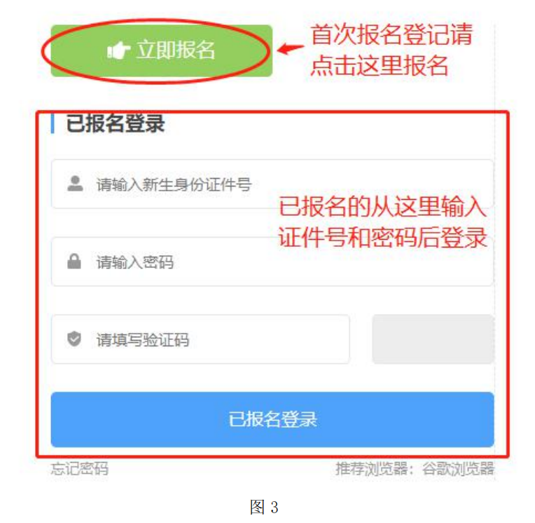 3.【已报名登录】:报名期间,已报名的新生需要查看报名详情或更改资料的,家长可以通过页面上的“已报名登录”,进行查看详情或修改内容,如图 3。输入新生证件号,输入密码及验证码,点击“已报名登录”,初始密为 12345678。