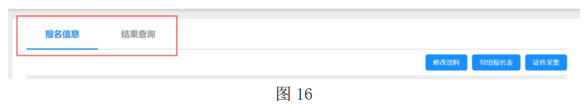 保存成功后返回报名完成界面(图 16),系统还包括了“报名信息”、“结果查询”,可以分别点击进入进行资料、证件修改和打印报名表。