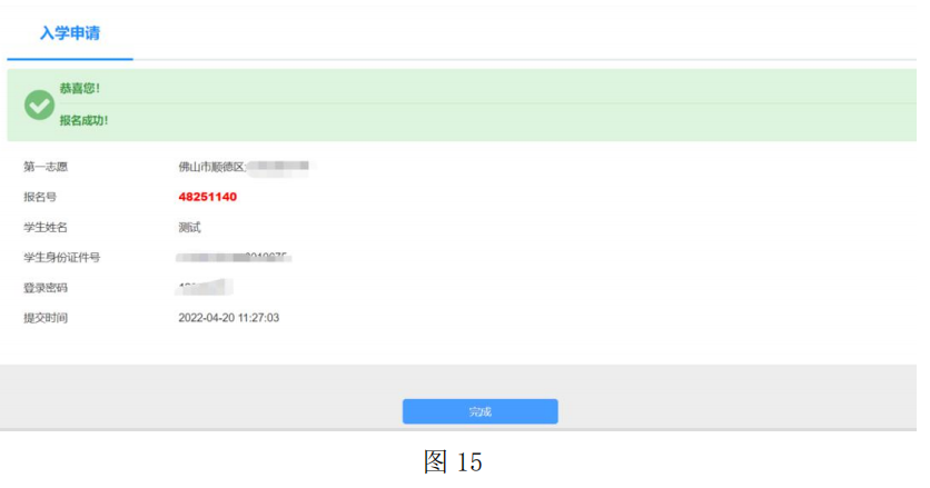 6.提交后,系统自动产生报名号及登录密码,请注意留存,(图 15)。点击“完成”按钮。系统自动跳转进入报名信息表格页面。