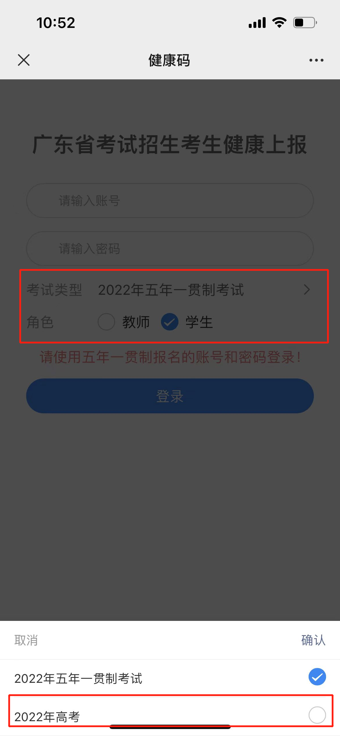进入健康申报系统后,输入账号及密码,选择【考试类型】及【角色】;