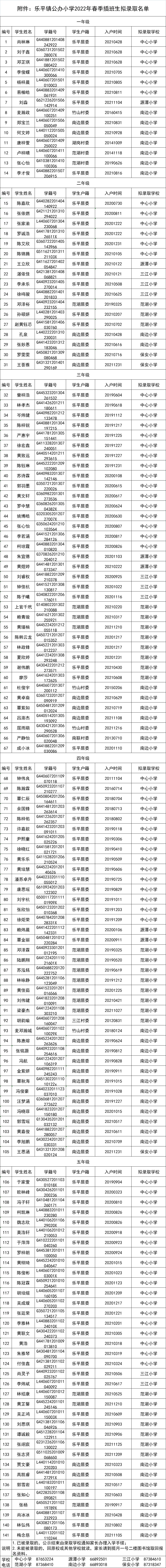 名单公示:2022年春季乐平镇公办小学插班生。
