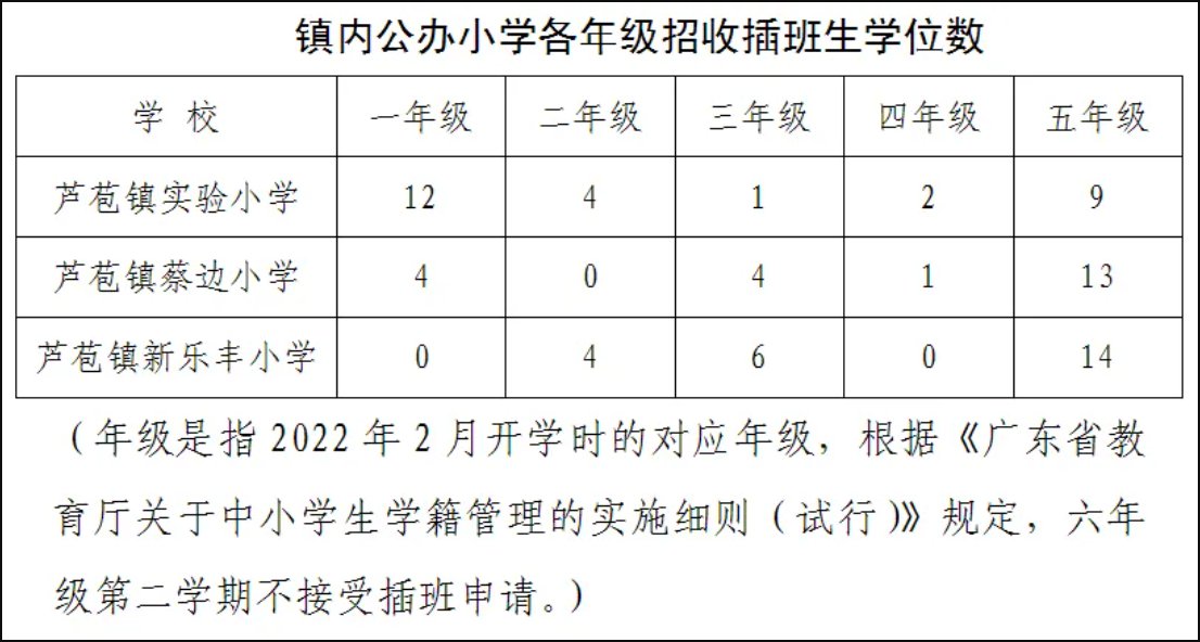 根据《三水区教育局关于进一步规范招生和学籍管理工作的通知》和《关于做好义务教育阶段转学插班工作的通知》的文件要求,我镇公办小学在2022年春季招收一至五年级插班学生。现将各学校招收插班生学位数、报名条件及申请办理手续予以公布: