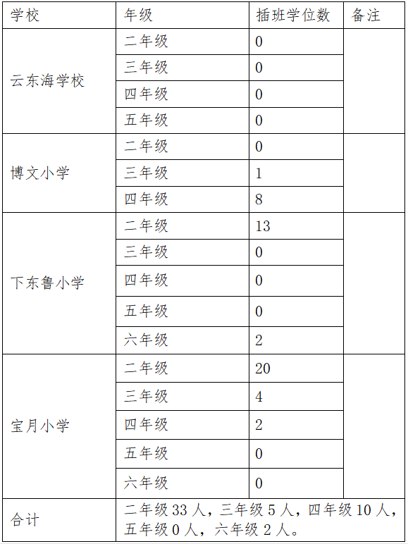 佛山三水区云东海街道2022年秋季学期公办小学插班招生名额: