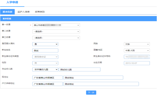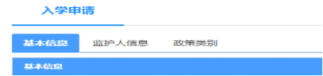 五、填写入学申请:点击“开始报名”进入“入学申请”页面,根据“入学申请”页面:依次填写基本信息>>监护人信息>>政策类别。