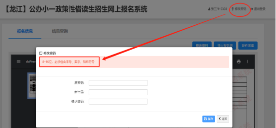 首次报名结束后的初始密码为12345678。家长可通过右上角【修改密码】功能修改,密码要求8~16位,必须包含字母、数字、特殊符号,请务必保存好密码。