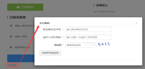 家长可通过报名系统报名页面上的【忘记密码】按钮进行密码重置。输入新生身份证号码和监护人手机号码、验证码,点击【发送手机验证码】按钮,再输入短信验证码和新密码,点击【修改密码】,重置成功后,请务必保存好密码。