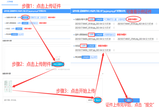 (2)家长点击蓝底【上传证件】,再点击上传或拖动附件至此页面;