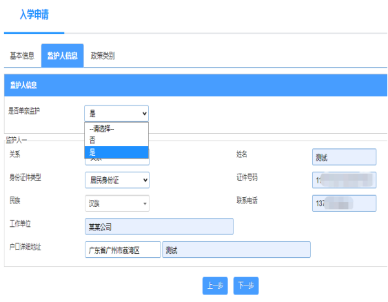 七、监护人信息:根据实际情况填写监护人信息,监护人信息填写完毕后,点击【下一步】。