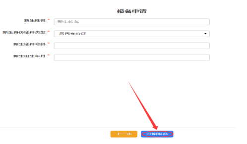 四、报名申请:查阅报名提醒后,点击【下一步】,进入报名申请页面,输入新生姓名、身份证号码,以上信息确认无误后点击下方【开始报名】按钮。
