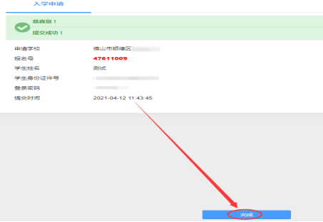 提交报名申请后,系统自动产生报名号及登录密码(已报名的初始密码为12345678),请务必保存好密码。点击【完成】按钮,系统自动跳转进入已报名登录页面。