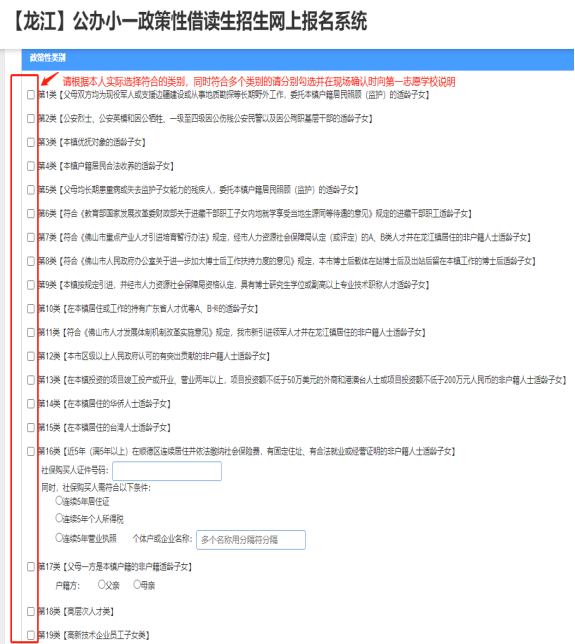 说明:第16类(社保类)的家长无需到有关部门开具证明,在对应位置上传社保卡、居住证和《龙江镇小学一年级政策性借读生信息登记表》。