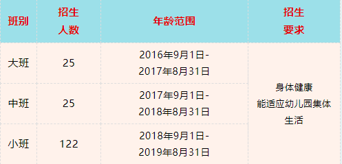 1、小班招收对象为2018年9月1日至2019年8月31日出生的幼儿,中班和大班插班生年龄下限依次前移一年。