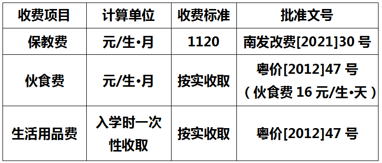 3、目前收费标准按照南发改费[2021]30号文件执行,鉴于幼儿园2022年9月1日才开学,开学前收费标准如有调整则按南海区发展和改革局最新核定的标准执行;代收代支费按实收取。
