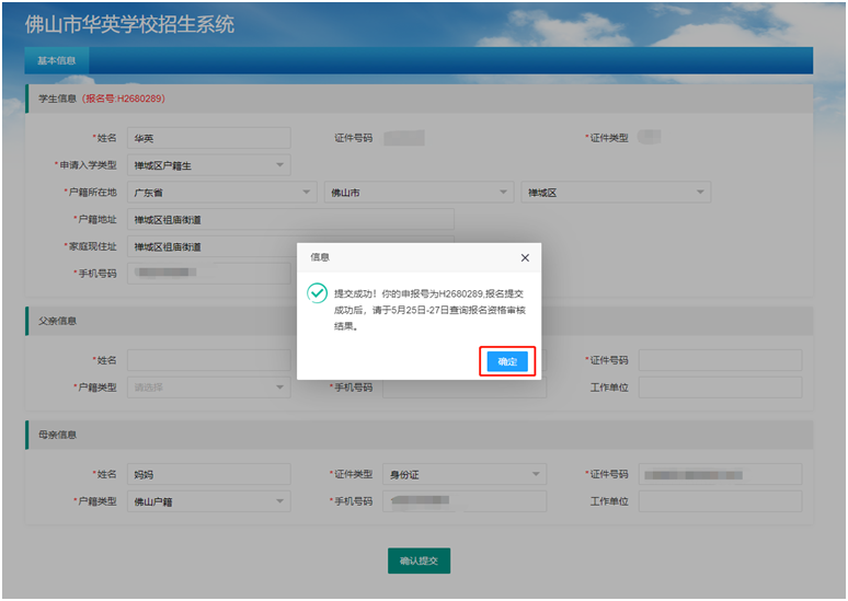 5月25日至5月27日,家长登录“佛山市华英学校招生系统”(网址:https://cczs.fsccjy.com/huaying/)查询审核结果。