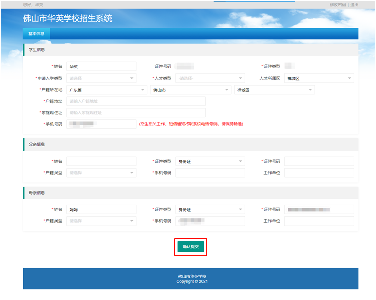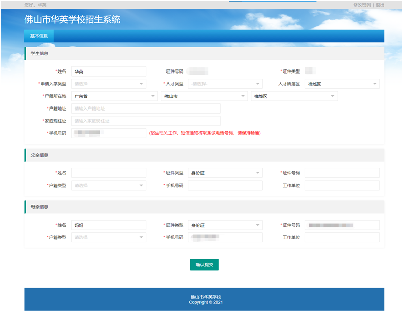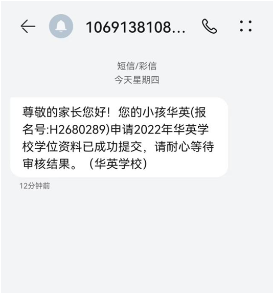 家长填报所有信息并确认无误后点击“确认提交”完成网上报名→随后注册的家长手机号会收到由“华英学校”发出的报名成功短信。