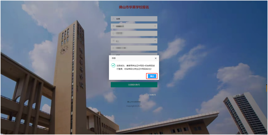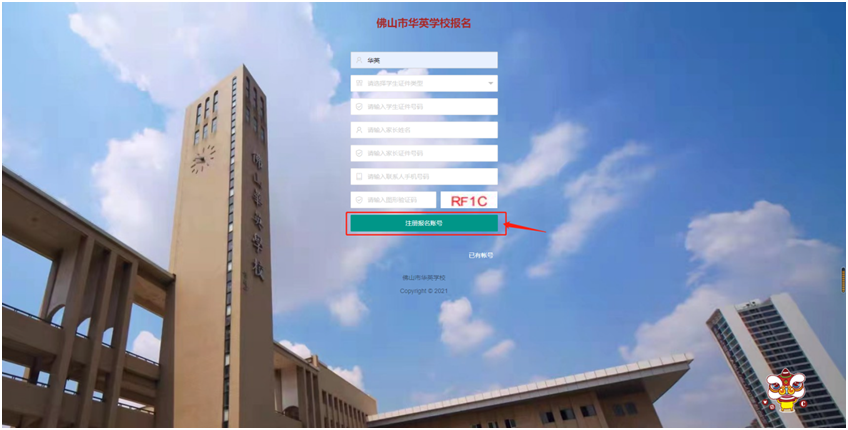 登录“佛山市华英学校招生系统”(网址:https://cczs.fsccjy.com/huaying/)→点击“注册报名账号”→认真阅读《招生信息核验授权书》,然后点击“同意”→在注册界面填写完整的注册信息后,点击下方“注册报名账号”→“注册成功”后在提示框点击“同意”完成注册报名账号。