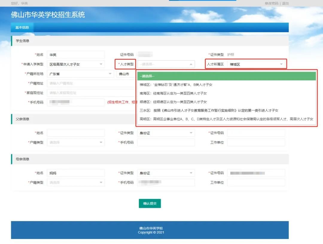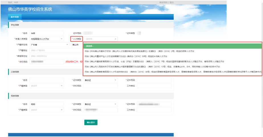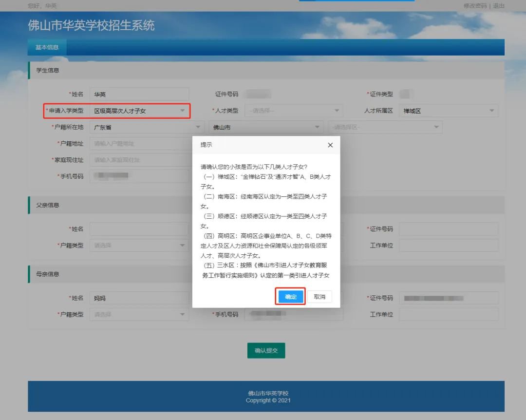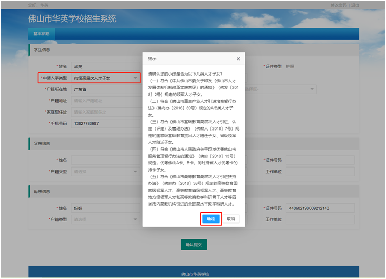 家长选择申请入学类型为“市级高层次人才”或“区级高层次人才”的,请确保符合市、区高层次人才子女报读条件。