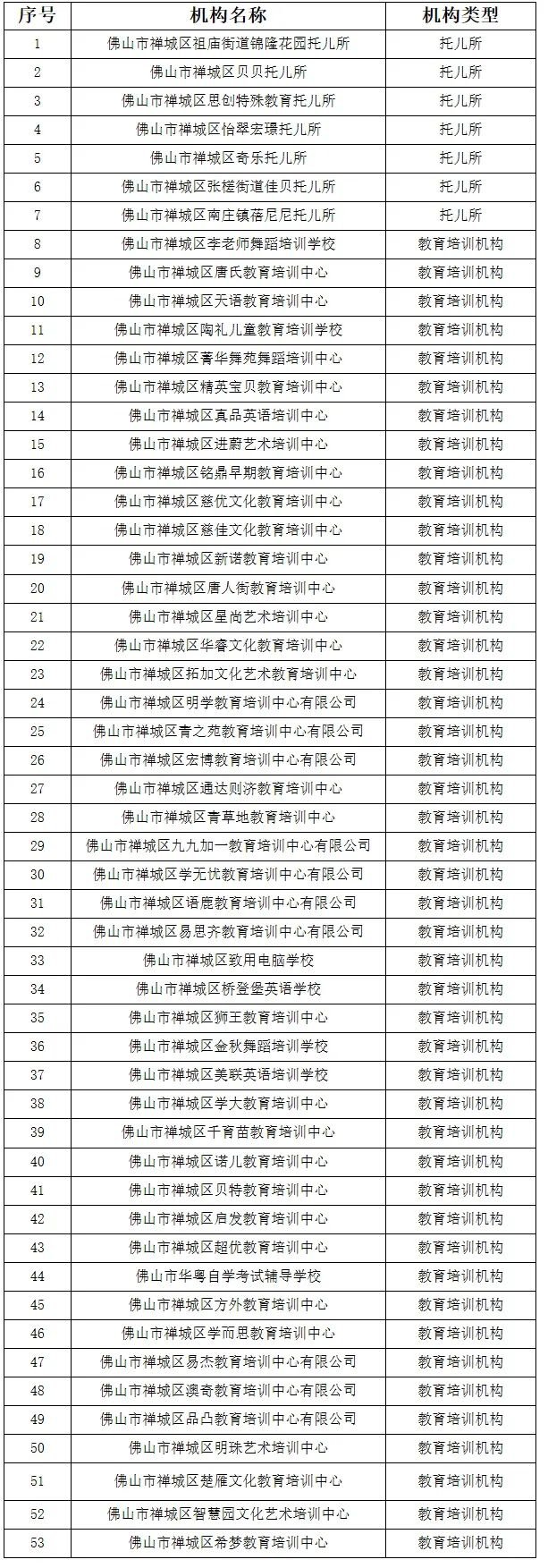 根据《佛山市新型冠状病毒肺炎疫情防控指挥部办公室关于印发佛山市教育培训机构应对疫情防控复课实施方案的通知》(佛防疫指办〔2020〕541号)以及《佛山市新冠肺炎疫情防控指挥部办公室学生返校工作专班关于做好疫情期间校外培训机构线下服务工作的通知(佛教防组〔2020〕45号)要求,禅城区新型冠状病毒肺炎疫情防控指挥部办公室教育管理组按照《佛山市2020年教育培训机构复课卫生防疫核验标准》对教育培训机构进行现场验收,经区新冠肺炎疫情防控指挥部办公室审批,同意第一批次教育培训机构于6月8日后复课,现将名单予以公布。