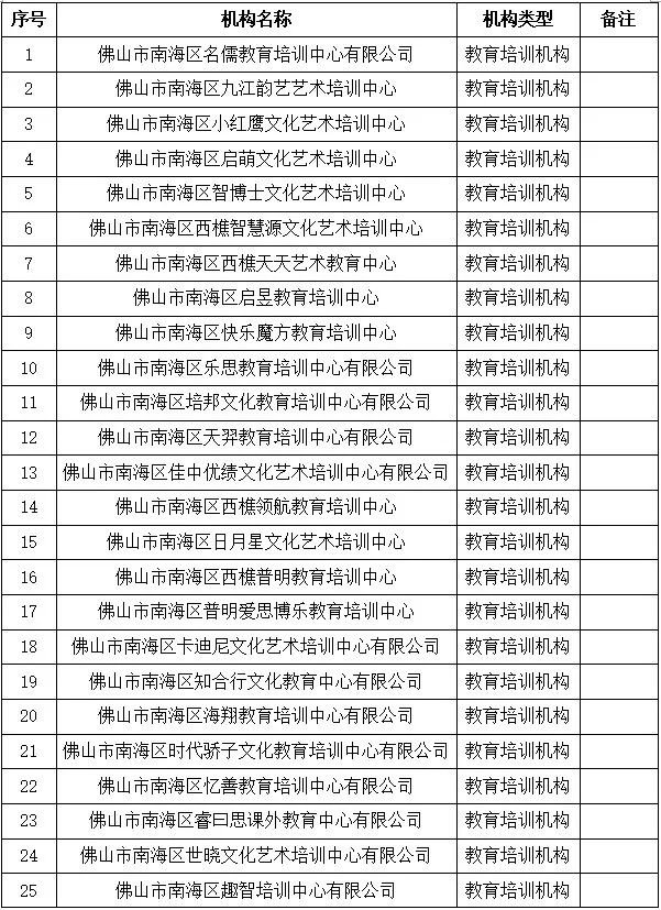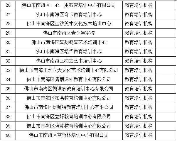 根据《佛山市新型冠状病毒肺炎疫情防控指挥部办公室关于印发佛山市教育培训机构应对疫情防控复课实施方案的通知》(佛防疫指办〔2020〕541号)和《佛山市新冠肺炎疫情防控指挥部办公室学生返校工作专班关于做好疫情期间校外培训机构线下服务工作的通知》(佛教防组〔2020〕45号)文件精神,针对教育部门许可的教育培训机构,经机构自主申报,核验组现场验收,南海区新冠肺炎疫情防控指挥部办公室审核,现将第二批准予复课的教育培训机构名单公布如下: