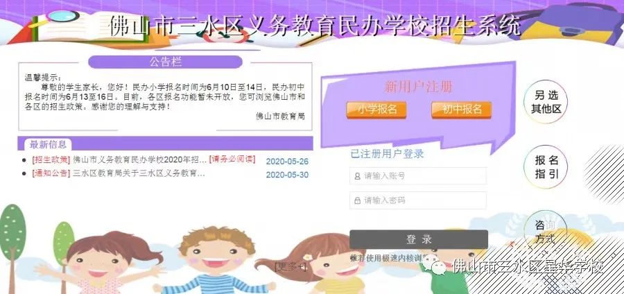 在规定时间内(具体时间节点安排见报名及录取流程),家长登录佛山市义务教育民办学校招生信息管理平台(https://mbzs.edu.foshan.gov.cn)佛山市三水区义务教育民办学校招生系统(https://ssmbzs.edu.foshan.gov.cn),注册用户并准确填写报名信息。第一轮第一阶段可平行选报3个志愿,第二阶段可平行选报2个志愿。在报名时间截止前,注册和报名信息可以修改。