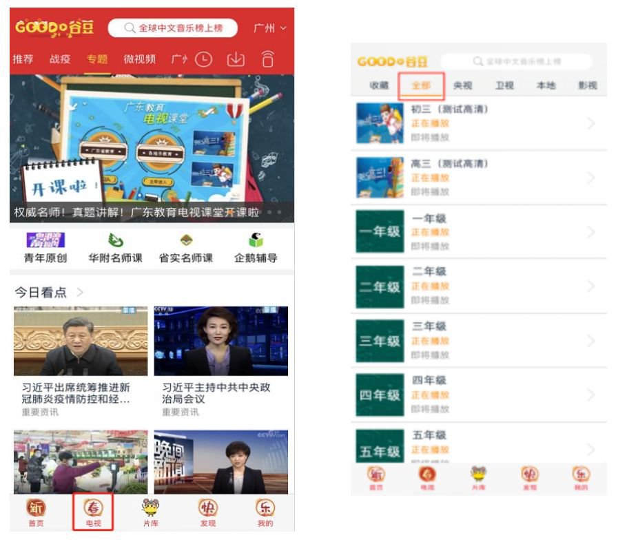 安装手机端“谷豆TV”APP的师生可以通过手机观课,用户登录“谷豆TV”APP,进入菜单“电视”,选择各年级观看直播课程,或进入菜单“专题”点播相应的教学内容。
