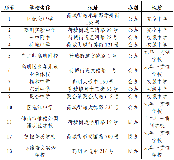 2022年高明区接受佛山市第一中学指标生分配的初中学校名单: