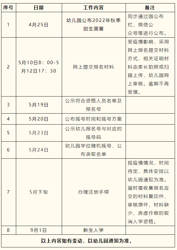 1、由于疫情原因,本次报名采用网上收集报名信息,网上审核资料,确定参加派位幼儿资格,再进行派位和录取。录取后,将再收集报名时需上交资料的复印件,同时审核原件。若报名资料与实际 资料不相符或缺少资料或弄虚作假的,按不符合条件处理,取消录取资格。