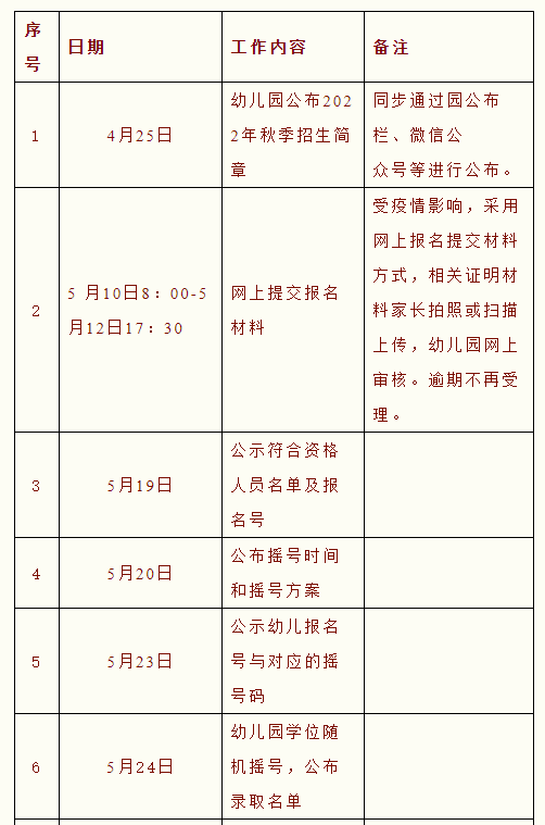 1、由于疫情原因,本次报名采用网上收集报名信息,网上审核资料,确定参加派位幼儿资格,再进行派位和录取。录取后,将再收集报名时需上交资料的复印件,同时审核原件。若报名资料与实际资料不相符或缺少资料或弄虚作假的,按不符合条件处理,取消录取资格。