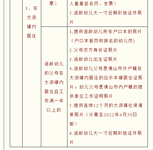 (3)适龄儿童的父母在大沥镇内居住,满足下列条件之一:①有大沥镇房产(或已备案的购房合同及发票);②在大沥镇居住,已领居住证(佛山市内户籍的提供父母在大沥镇内工作单位证明),同时具备居住期间至少连续12个月的大沥镇社保清单(计算至2022年4月30日前)。