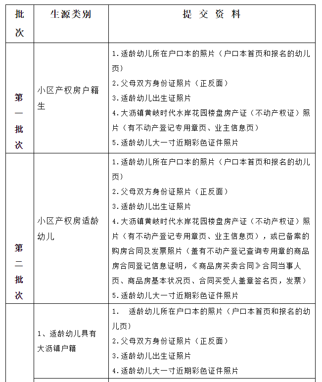 第一批次:房户一致的,即适龄幼儿的父母或法定监护人,拥有大沥镇黄岐时代水岸花园产权房【截止到2022年4月30日(含)已获得房产证(不动产权证)】且该幼儿户籍登记地址为大沥镇黄岐时代水岸花园(以户口本为准)。