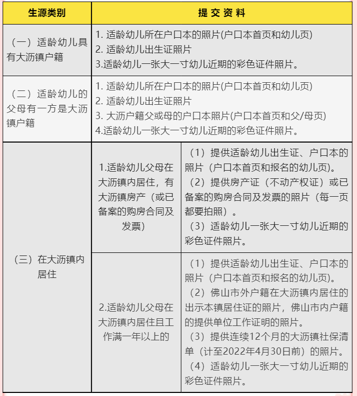 (3)适龄幼儿的父母在大沥镇内居住,满足下列条件之一:①有大沥镇房产(或已备案的购房合同及发票);②在大沥镇居住,已领居住证(佛山市内户籍的提供父母在大沥镇内工作单位证明),同时具备至少连续12个月的大沥镇社保清单(计至2022年4月30日前)。