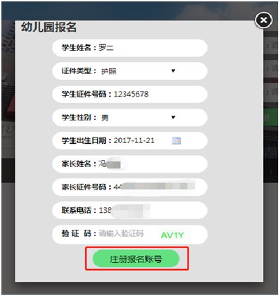 进入“幼儿园报名”注册界面,填写完整注册信息后,点击下方“注册报名账号”按钮。