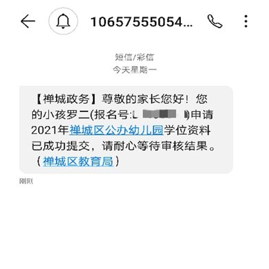 确认提交成功后,会弹出提示界面,点击“确定”键即完成电脑端网上报名。随后,注册的家长手机号会收到由“禅城政务”发出的报名确认短信。