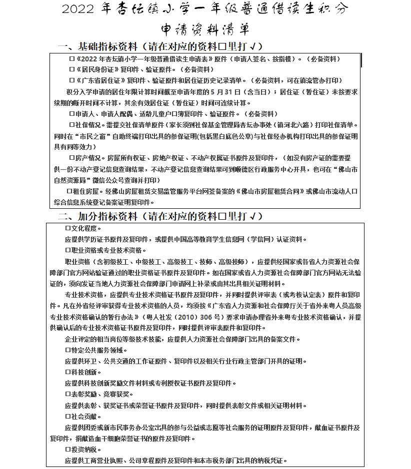 2022年顺德杏坛镇小学一年级普通借读生积分申请资料清单:点击下载
