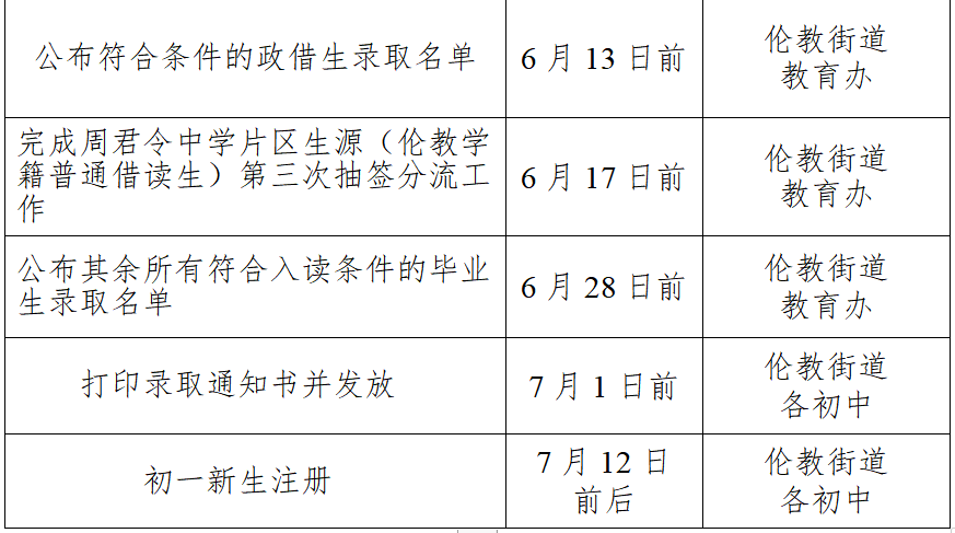 (二)审核材料,认定毕业生属性。凡审核认定为伦教街道户籍生和伦教学籍政策性借读生的,在学位充足的前提下,按批次直接录取到对应片区的初中学校。当所在片区学校学位不足时,按照以下分流办法对所属片区的生源进行分流。