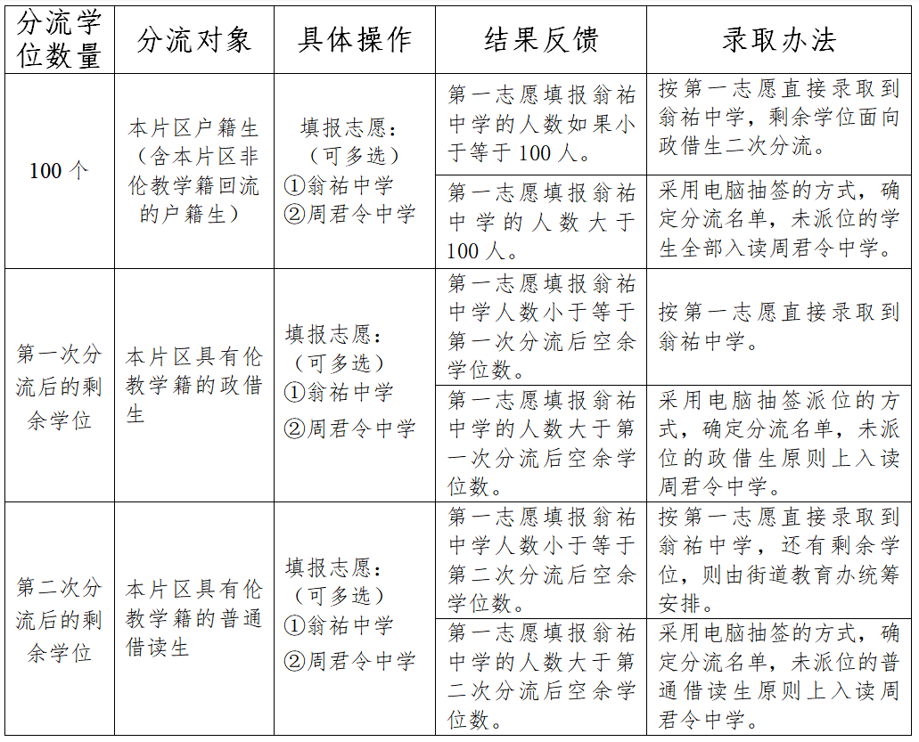 基于周君令中学学位不足的现状,将对该片区内的生源结合志愿填报情况进行电脑抽签派位分流(总计分流名额100个)。分流以第一志愿优先录取为原则,具体操作流程如下: