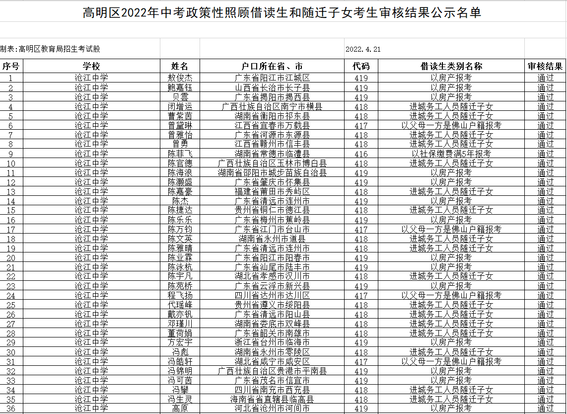 佛山高明2022中考政策性照顾借读生和随迁子女考生审核结果名单