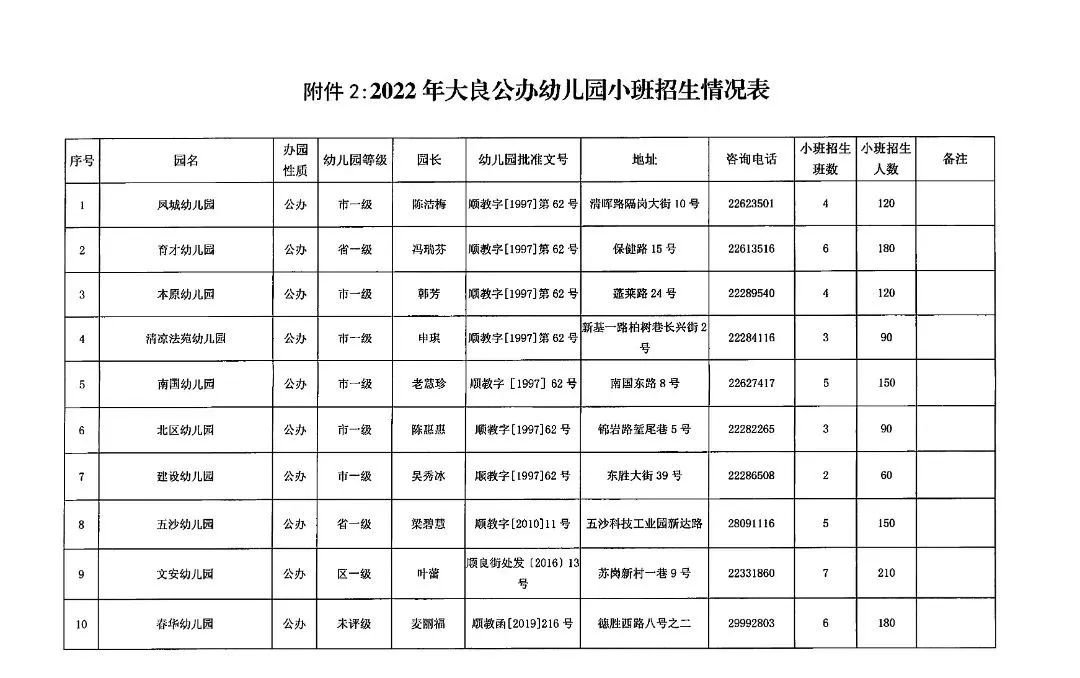 为规范大良街道育才、凤城、本原、南国、北区、清凉法苑、建设、五沙、文安、春华、明雅、江畔、顺峰、秋实及青葵(新开办)共十五所公办幼儿园的招生工作,确保招生公开、公平、透明,特制定2022年大良街道公办幼儿园小班招生方案。