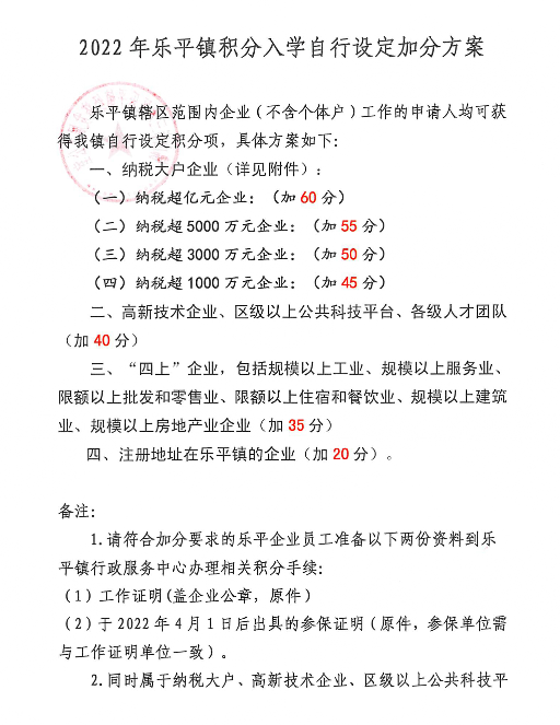 2022年佛山三水乐平镇积分入学自行设定加分方案