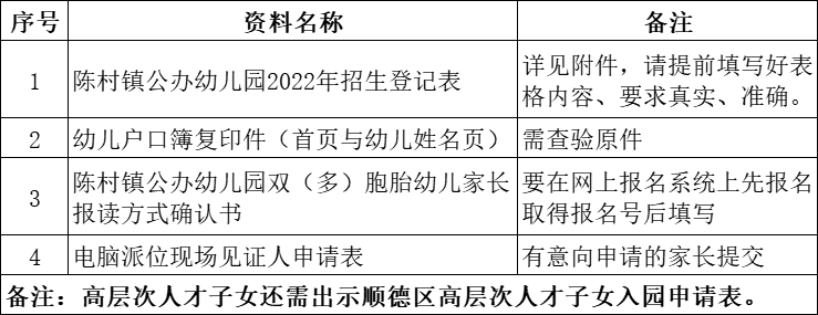 2022年佛山顺德陈村镇公办幼儿园报名资料要求:
