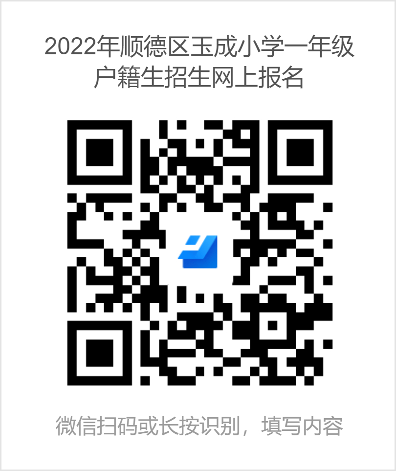 所有符合报名条件且有意向入读的学童家长先关注“玉成小学”微信公众号,再通过点击进入识别“玉成小学”网上报名二维码,填写相关信息完成后提交.填报校区一栏中有玉成小学本部和玉成小学环湖校区两个选项,家长可单选或多选,一经填报选项将被默认参与全部招生环节。