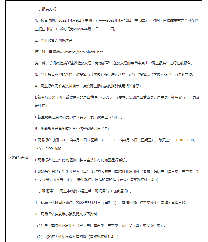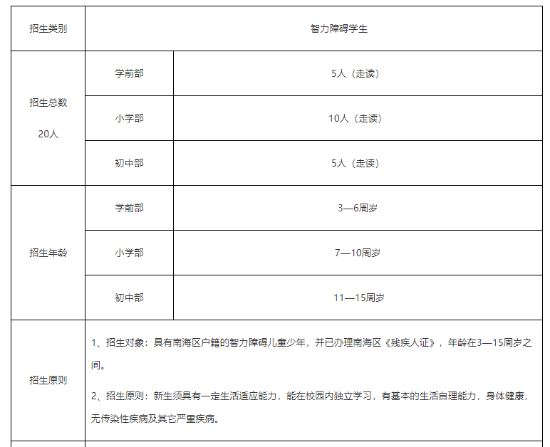 根据南海区教育局制订的《佛山市南海区义务教育阶段特殊教育招生工作指引(试行)》(南教基〔2009〕51号)、《关于同意设立南海区星辉学校特殊教育学前部(试点)的批复》(南教基〔2017〕36号)等文件精神和我校的实际情况确定本学年度的招生简章,具体如下: