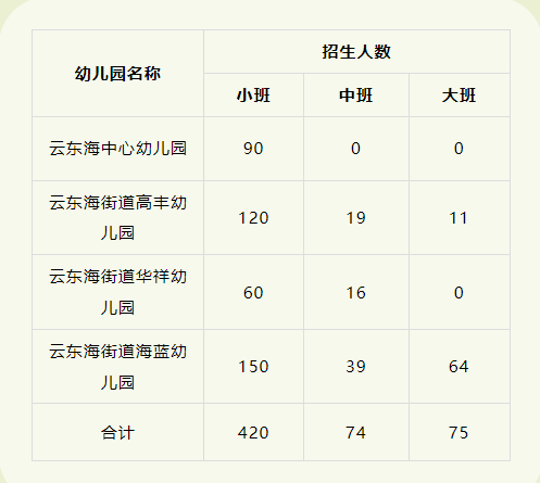 云东海街道公办幼儿园2022年秋季学期招生计划表
